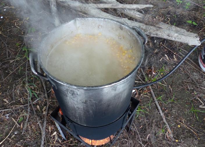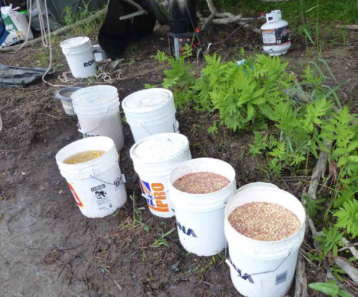 I brought almost 50kg of dry maize with me. I have 4 x 5 gallon (17 litre) buckets that I spin. Two are for soaking the maize, while the other two are for cooking. This way I can put two buckets of cooked maize in the morning and evening.