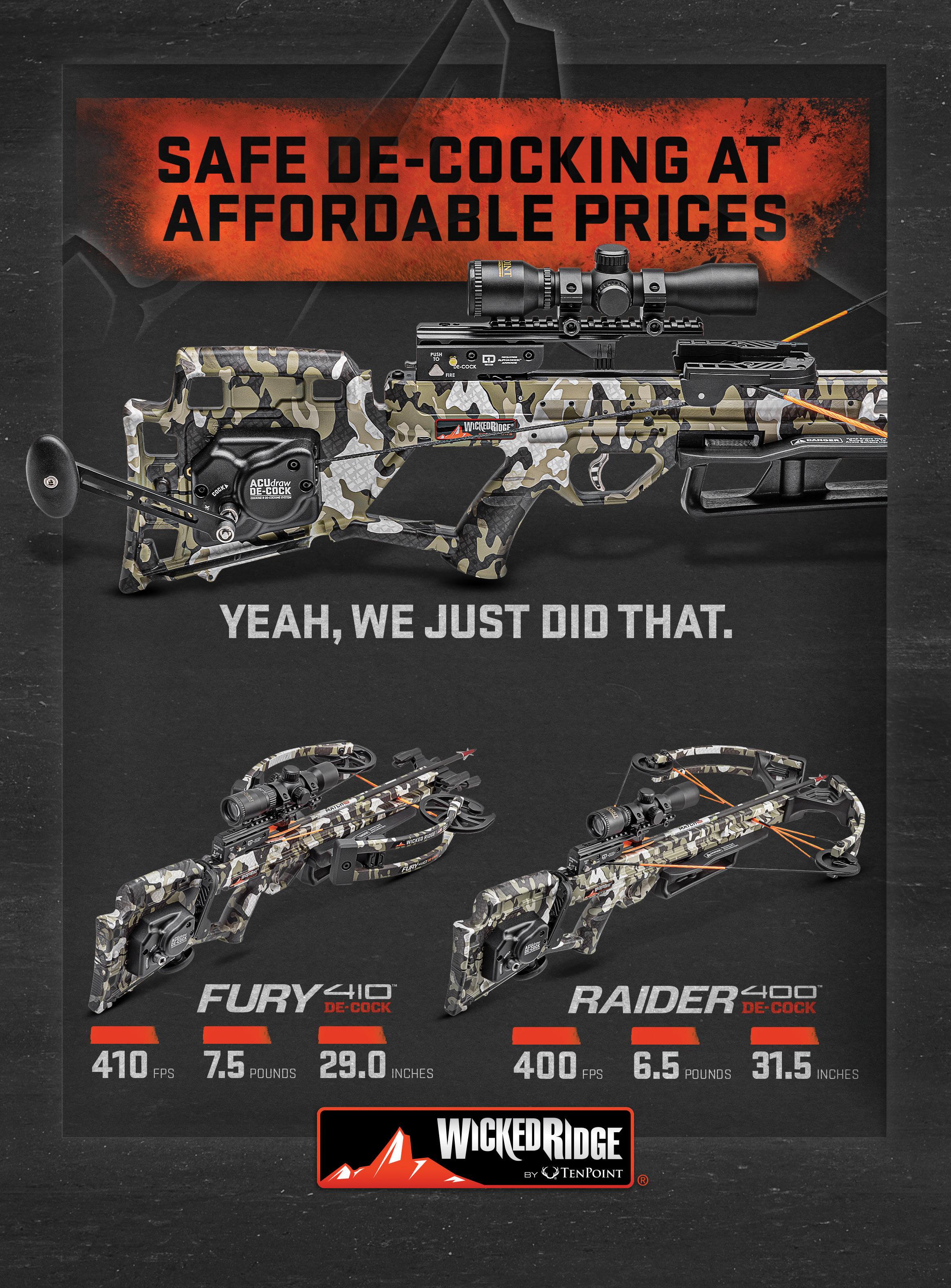 For most hunters, we just made your crossbow obsolete. Forget the hassle of discharging your bow at the end of the hunt and damaging arrows – the Wicked Ridge Fury 410 De-Cock and Raider 400 De-Cock crossbows silently cock and safely de-cock with the revolutionary ACUdraw De-Cock.