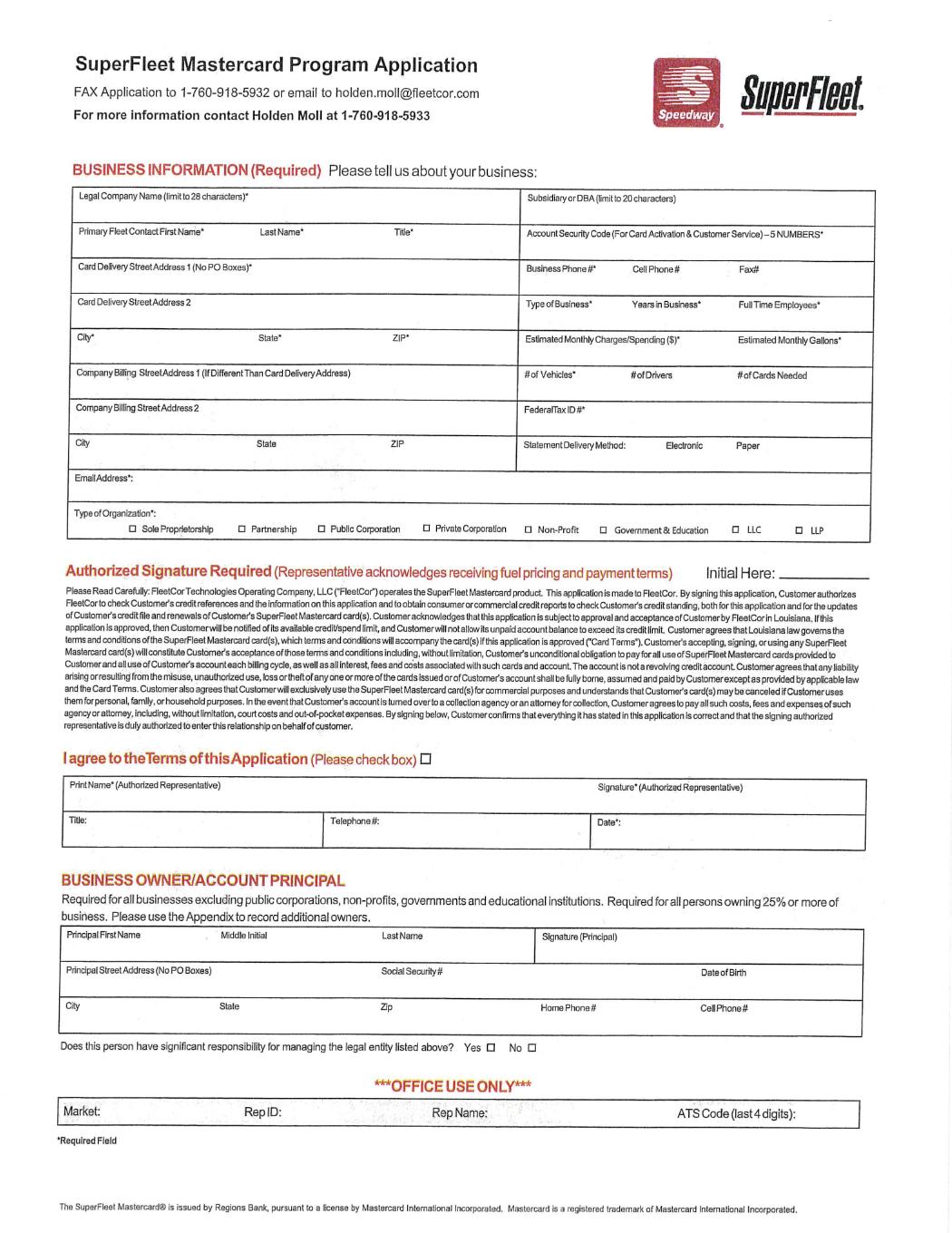 Application Terms: By signing this Application, the Authorized Representative represents, warrants, and agrees that: (a) he or she is authorized to apply to FLEETCOR TechnologiesOperating Company, LLC (“FLEETCOR”), a Louisiana limited liability company, for an unsecured, partially secured, or fully secured line of credit (“Account”) on behalf of the company identified above (“Client”); (b) FLEETCOR may obtain Client’s credit report and check Client’s credit standing when processing this Application or periodically evaluating any resulting Account’s creditworthiness; (c) this Application is subject to approval and acceptance by FLEETCOR; (d) if the Application is approved by FLEETCOR in Louisiana, the resulting Account: (i) will be governed by Louisiana law; (ii) will not be a revolving credit account and the Amount Due/Total Amount Due shown on each Account Statement will be due and payable on the Due Date shown on the Statement; (iii) will be used solely for commercial purposes and not for personal or household purposes; (iv) will be suspended, and the Client’s redit history may be reported to credit reporting agencies, if the Client’s unpaid balance ever meets the Account’s Credit/Spend Limit; and (e) acceptance, signing (in whatever form), or use of any of the Cards issued to Client will constitute Client’s acceptance of the Client Agreement available at www.fleetcor.com/terms/7-Eleven-mc or www.fleetcor.com/terms/7-Eleven-dn Equal Credit Opportunity Act Notice. The Federal Equal Credit Opportunity Act prohibits creditors from discriminating against credit applicants on the basis of race, color, religion, national origin, sex, marital status, age (provided that the applicant has the capacity to enter into a binding contract); because all or part of the applicant’s income derives from any public assistance program; or because the applicant has in good faith exercised any right under the Consumer Credit Protection Act. The federal agency that administers compliance with this law concerning this creditor is the Federal Trade Commission, Equal Credit Opportunity Act, Washington, D.C. 2 0580. FLEETCOR considers your privacy important. View our privacy policy available at www.fleetcor.com/privacy-policy to find out more.