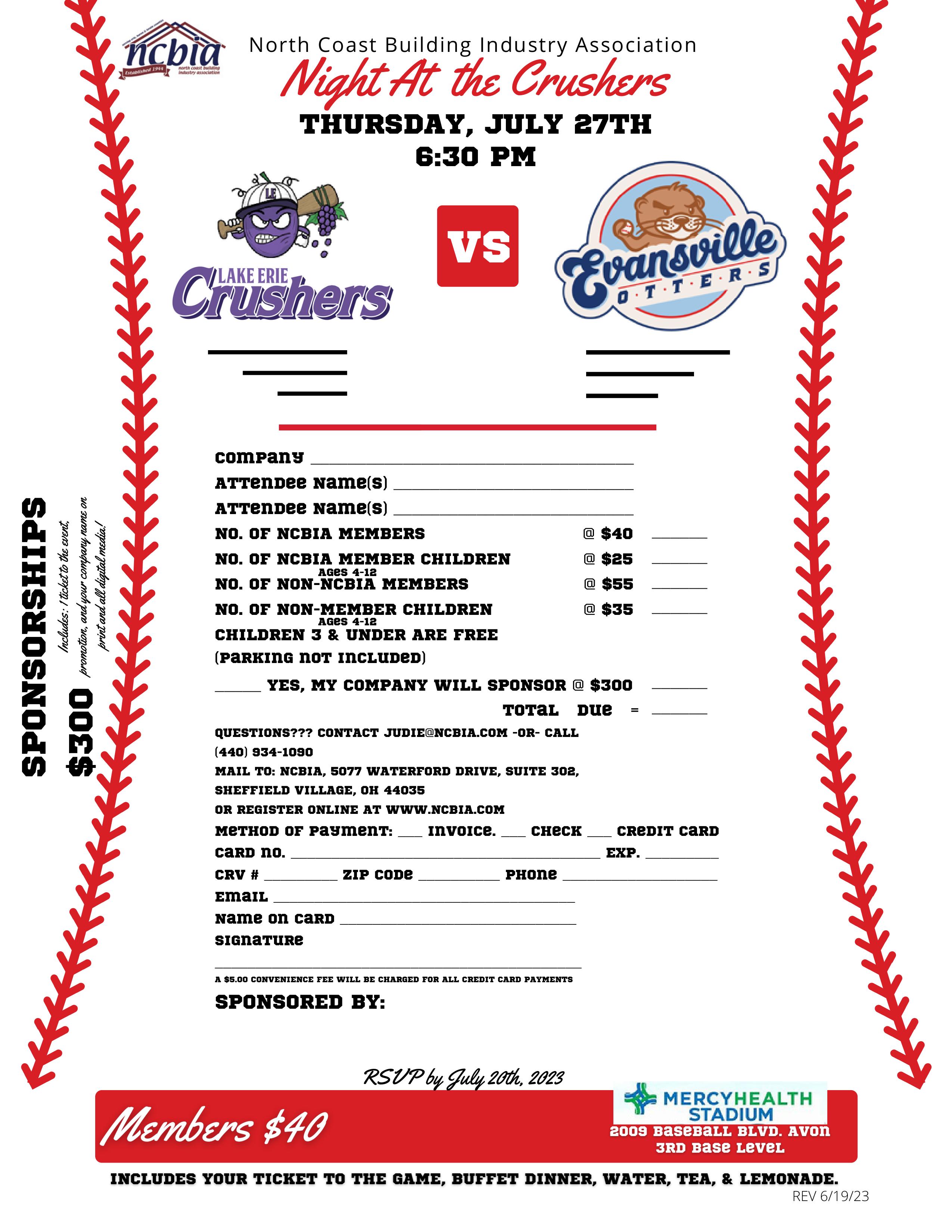 24 18 39 JUL 4th Independence Day Independence Day | OfficeClosed Office Closed Night at theCrushers Night at the Crushers ** | 6:30 6:30 Mercy Health Stadium (2009 Baseball Boulevard, Avon) 27th Thursday Tuesday CALENDAR OF EVENTS 2023 AUG 3 rd Golf Classic Golf Classic ** || 8 AM 8AM Legacy@SweetbriarGolfCourse(750JaycoxRd.,AvonLake) Thursday 17th Membership Mixer MembershipMixer ** | 5-7 PM 5-7PM Thursday th NAHB Association Management Conference NAHBAssociationManagementConference | OfficeClosed - Staff Attending OfficeClosed-StaffAttending Monday-Thursday 21-24 Cincinnati,OH HarborHouse(132MainStreet,Huron) 9 th Executive Committee ExecutiveCommittee-- 3:30 3:30 || Board Meeting BoardMeeting 5:00 ClubhouseatPreservesatFrenchCreek(5800PreserveDrive,SheffieldVillage) Wednesday JUN 23rd General Membership Meeting/Cookout General Membership Meeting/Cookout ** || 11:30 AM-1 PM 11:30AM-1 PM Pogie's Clubhouse (150 Jefferson St. Amherst) National Homeownership Month National NAHB Leadership Meetings NAHB //Legislative Conference LegislativeConference 6-10th Washington D.C. 20-22 OHBA Summer Board Meeting OHBA Summer Board Meeting nd Kent State University Hotel & Conference Center Friday Tuesday-Thursday Tuesday-Saturday Codes Session Session ||1 PM - 2 PM 1 PM- 2 ClubhouseatPreservesatFrenchCreek(5800PreserveDrive,SheffieldVillage) SEP Associate Member Appreciation Month AssociateMemberAppreciationMonth 4 th 9th Softball Game & Family Picnic SoftballGame&FamilyPicnic ** || 1-5PM 1-5PM Labor Day LaborDay || Office Closed OfficeClosed Saturday Monday ClubhouseatPreservesatFrenchCreek(5800PreserveDrive,SheffieldVillage) 13th 21st Executive Committee ExecutiveCommittee-- 3:30 3:30 || Board Meeting BoardMeeting 5:00 5:00 Member Mixer MemberMixer ** || 5-7 PM 5-7PM Thursday Wednesday AmherstTownshipPark(44786MiddleRidgeRoad,Amherst) Location-TBD 19-21st NAHB Leadership Meeting NAHBLeadershipMeeting Tuesday-Thursday JWMarriotDesertSpringsResortPalmSprings,CA 25-26 2023MEMBER
