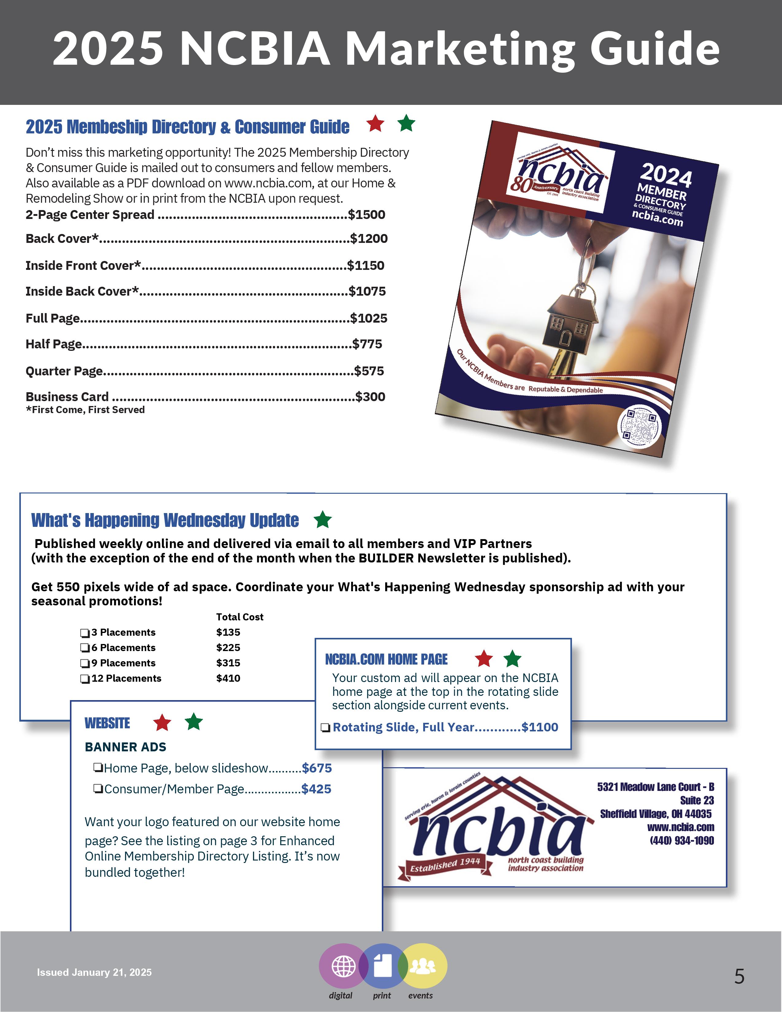 North Coast Building Industry Association (NCBIA) BUILDER newsletter is the official newsletter of the NCBIA and is published monthly by the NCBIA. The NCBIA is an affiliate of the Ohio Home Builders Association (OHBA) & the National Association of Home Builders (NAHB).