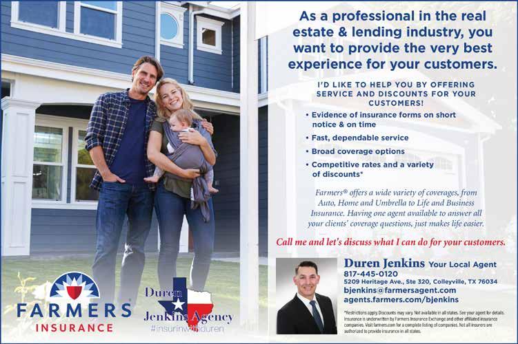 2 • February 2023 @realproducers Scan To Order Online! Strengthening Your Partnerships & Client Relationships Is Easy As Pie! ButtermilkSkyPie.com/Locations/Colleyville | 4712 Colleyville Blvd #160 | Colleyville Make Every Closing A Breeze! Insurance Will Never Delay Another Closing With Our Agency! Over 100 Years Of Combined Experience We Partner With Many Companies To Find The Right Coverage For Your Clients Quick Turnaround Jason Ridley Agency 817.281.4500 JasonRidleyAgency.com 5303 Colleyville Blvd., Ste. A | Colleyville