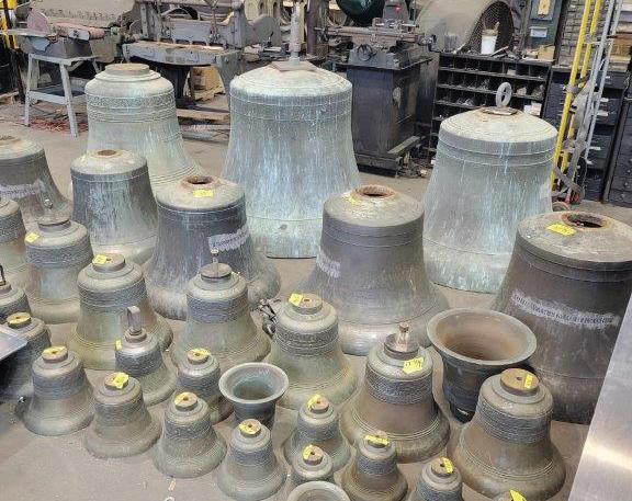 Company, the playing key board is nearly complete, all the original Meneely bells have had cast iron lugs and internal plates removed and the bell frame has been re-assembled. Currently, the company is creating draw ings for new head pieces and clappers for each bell.