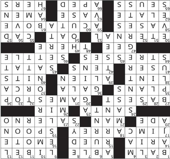 44) Highlights 46) Agree out of court 47) "___ whiz!" 48) "Voilà!" 50) Everlasting 54) Bran source 55) Heel 58) Flower holders 59) Slightly better than 62) Fill with joy 63) Bouquet holder 64) "Preach!" 65) Grinch creator 66) Mimicked 67) Towel word Down 1) ___ Blast (Mountain Dew flavor) 2) Dry 3) Key ___ Pie 4) PC alternative 5) Extreme 6) Charred 7) Director Spike 8) Ice cream brand 9) WNBA legend Lisa 10) Copy 11) Barbarian