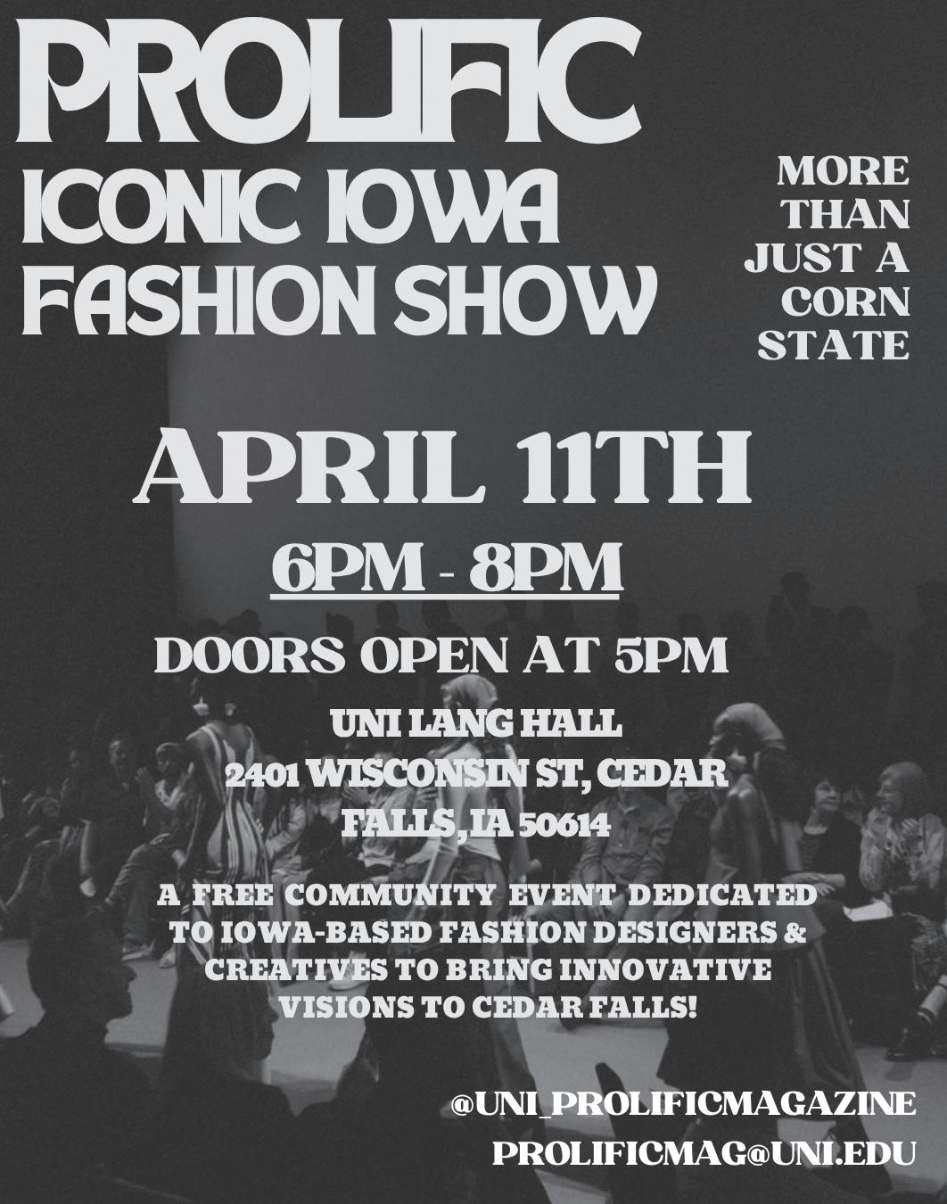 Prolific Magazine, an inclusive multicultural student organization dedicated to amplifying underrepresented voices, will host its “Iconic Iowa” Fashion Show on April 11 from 6 p.m. to 8 p.m. in the Lang Hall Auditorium at UNI, with doors opening at 5 p.m. The event is free and open to students, faculty and the community of Cedar Falls.