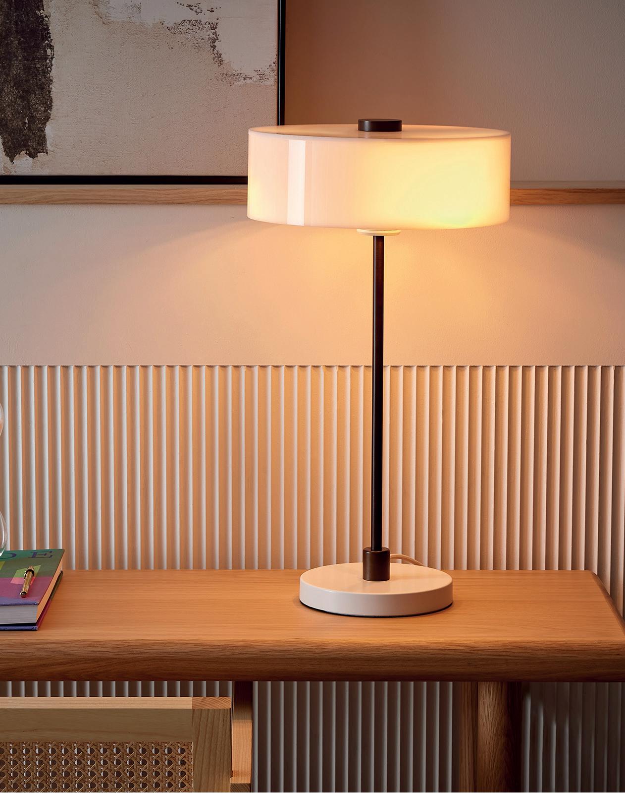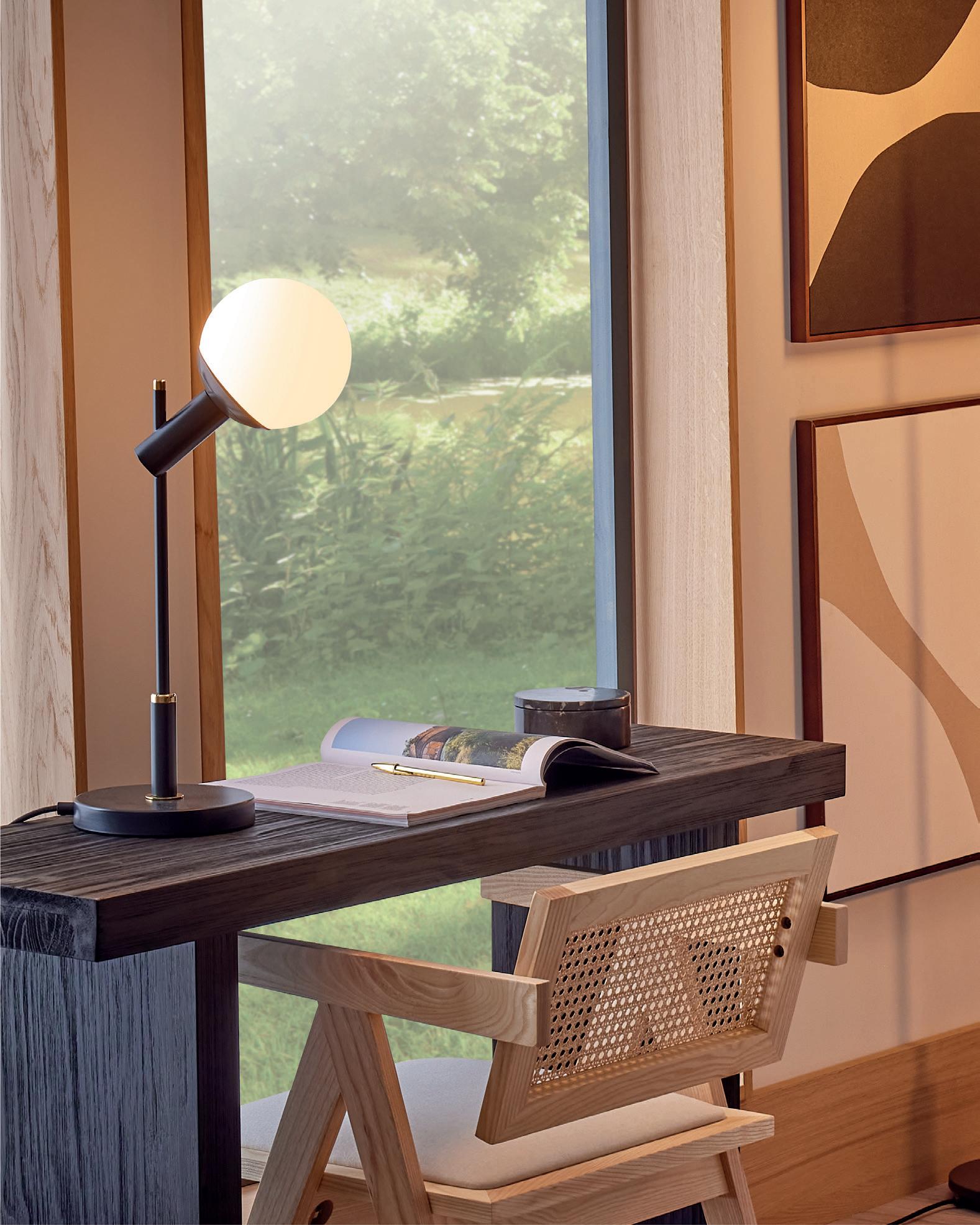 The Faro collection embraces minimalist simplicity with a robust rectangular base in a black-grey powdercoat finish. An angled polished brass segment directs light upwards from the matte opal glass shade, capturing the essence of quiet luxury. This range complements both contemporary and timeless interiors.