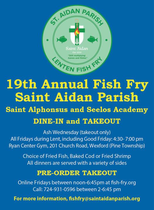 St. Aidan Fish Fry, 4:30-7 pm, Ash Wed, Feb. 18 (take out only), and all Fridays during Lent, including Good Friday, Ryan Center at St. Alphonsus / Blessed Francis Seelos Academy, 201 Church Rd., Wexford. Dine in or take out available, call (724) 9310596 or fishfry@saintaidanparish.org.