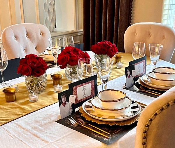 For the tablescape, I opted for a simple yet elegant theme using red, white, and gold tones. When I think of Ina, I picture timeless sophistication, so I went with classic red roses as the centerpiece, evoking her modern, yet classic entertaining style. To add a touch of whimsy, I created personalized place cards featuring a fun image of Ina with her hand raised, as if she were “holding” each guest’s name card. This small detail added a playful flair to the evening’s décor.
