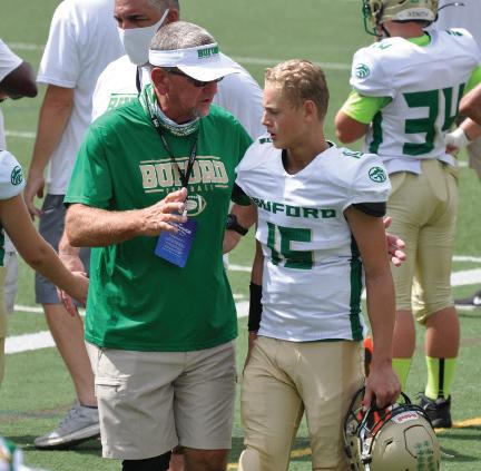 Top: Head coach Ken Burge gives encouragement to #15 Tommy Young during the GFL Division II Championship game. Above: Burge gives his players a pep talk during a practice session. Photos by Jay Young