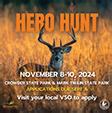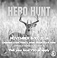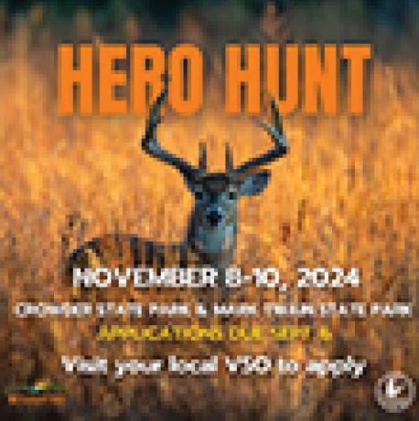 JEFFERSON CITY, MO, JULY 2, 2024 –Calling all Missouri veterans with a passion for hunting! Missouri State Parks is excited to team up with the Missouri Veterans Commission to offer 35 lucky veterans the opportunity for a weekend deer hunt at Mark Twain State Park (Hero Hunt) or Crowder State Park (General Crowder Hunt). These special hunts are being offered Nov. 8-10, 2024. Apply now for one of these all-inclusive hunting trips. Lodging and meals are provided along with a hunting guide, and if guests harvest deer, there will be limited processing as well. Applications must be picked up and returned to a local Veterans Service Office by Sept. 6. Find local office locations at mvc.dps.mo.gov/ service/serviceofficer/. Mark Twain State Park is located at 37352 Shrine Road in Florida, Missouri. Crowder State Park is located at 76 NW Highway 128, Trenton. For more information contact: Mark Twain Hero Hunt at 573-2489985 or General Crowder Hunt at 660-359-6473.