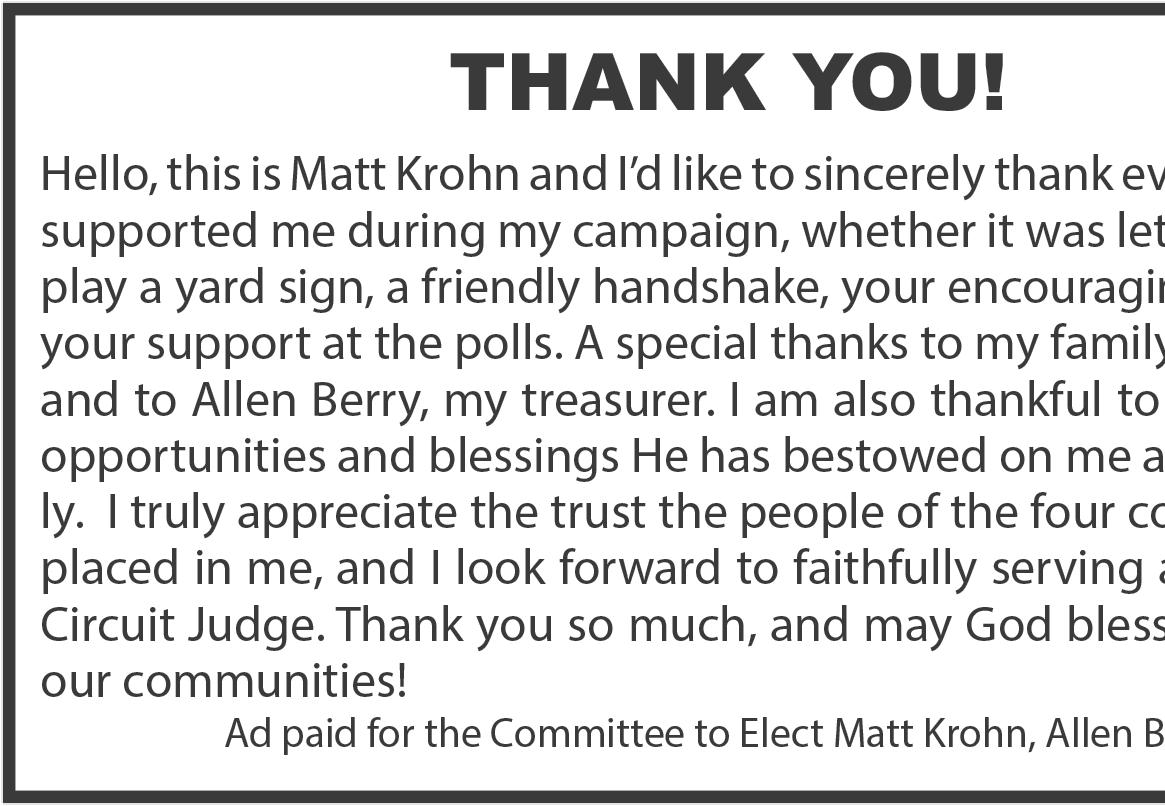 four counties in the 3rd Judicial Circuit to report its votes in the race between two Republican candidates, current 3rd Circuit Judge Steve Hudson of rural Trenton and Mercer County Associate Circuit Judge Matt Krohn of rural Princeton. And, his home county boosted Krohn into a big early lead, giving him 76.1% of the vote - 703-221.