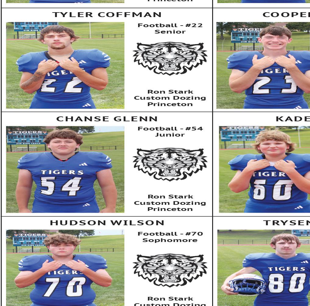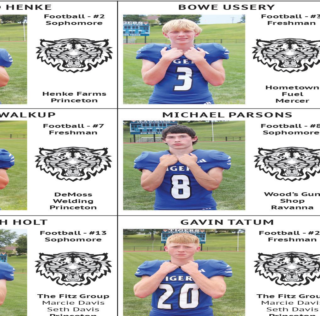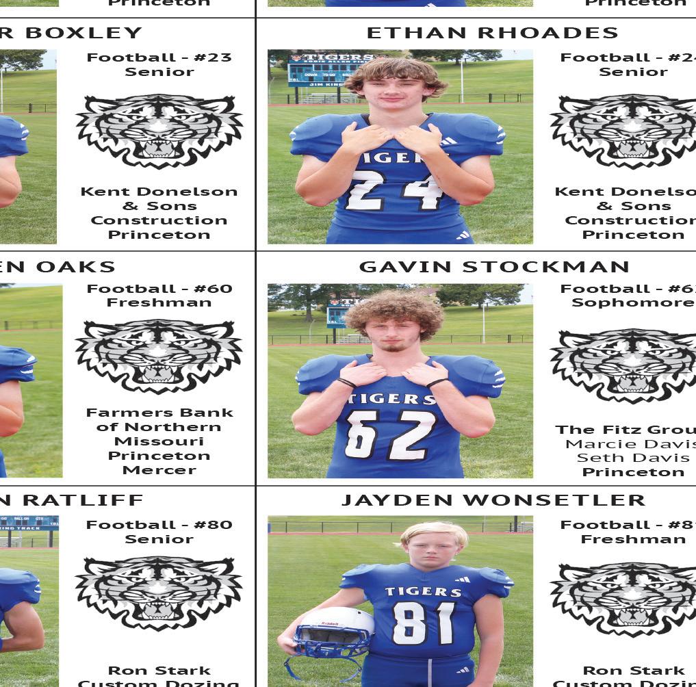 Tiger scores: Hailee Hein 55, Kassidi Alderson 60, Emily Oswalt 64, Gracie Mitchell. Team score: 245, second. at Albany, Mo., Sept. 23 (2-girl team best shot) Hein/Alderson, 43-53–96 (tied/7th); Mitchell/Remi Lewis, 57-58–115; Oswalt/Macey Johnson, 62-57–119. Princeton cross country at Chillcothe, Mo., Sept. 26 High school (JV) - Boys: 3. Caden Weathington (medal); 11. Hector Garcia. Girls: 5. Katie Bauer (medal). Times not available.