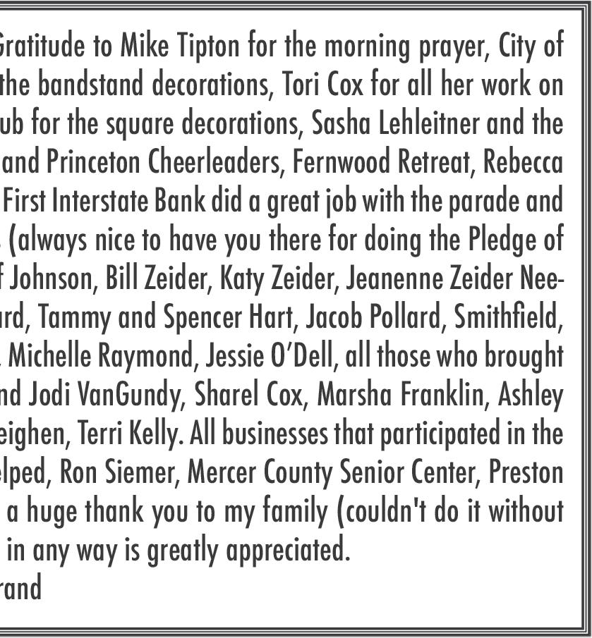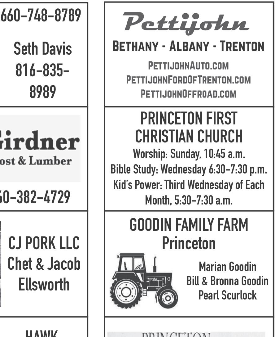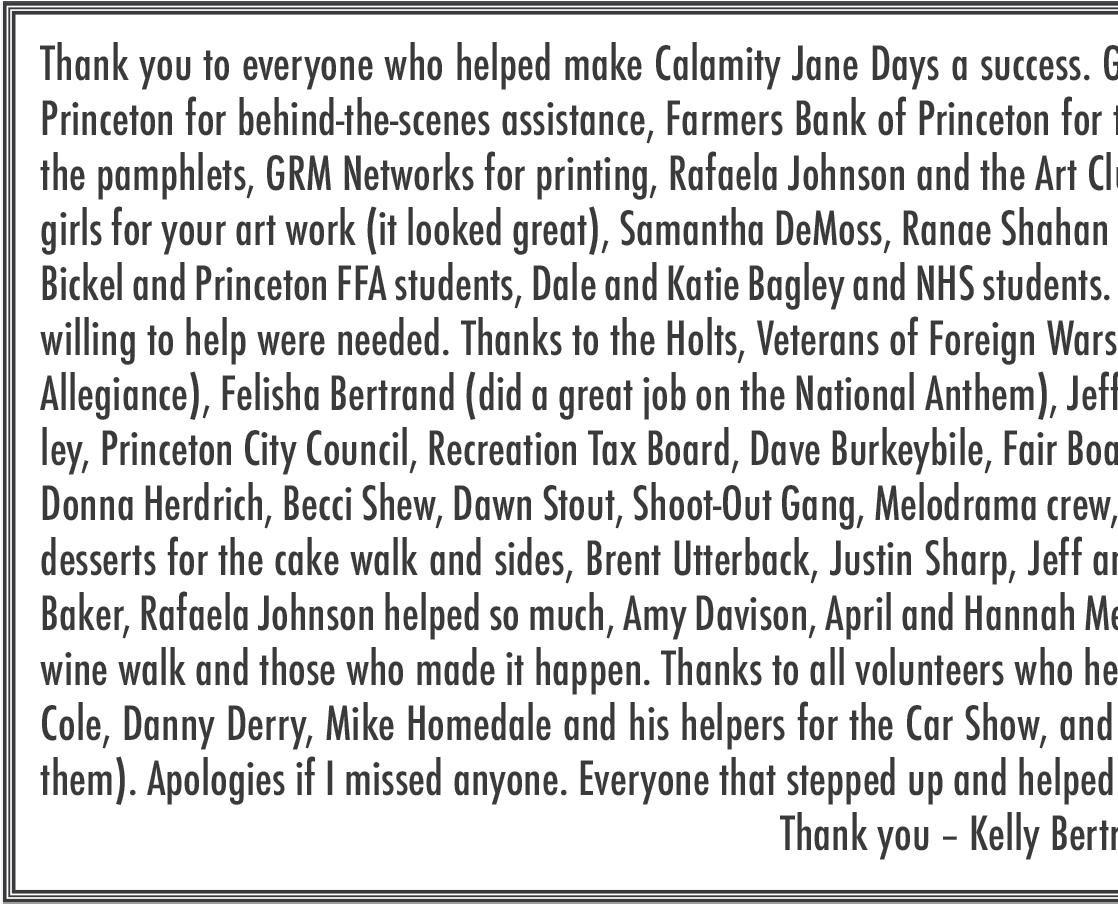 PRINCETON, Mo. The Princeton Chamber of Commerce met Wednesday, Sept. 25 at the old bank building. President Kelly Bertrand called the meeting to order. Jeanenne Neeley read the minutes of the last meeting. Kelly gave an overview of Calamity Jane Days, which had taken place the previous weekend. The Rotary breakfast was well attended as was the Nancy Shew 5K. There were 58 participants in the Tractor Cruise. Tracy Kilen gave a report on the parade, which was handled by First Interstate Bank this year. They would like to be in charge of the parade again next year and