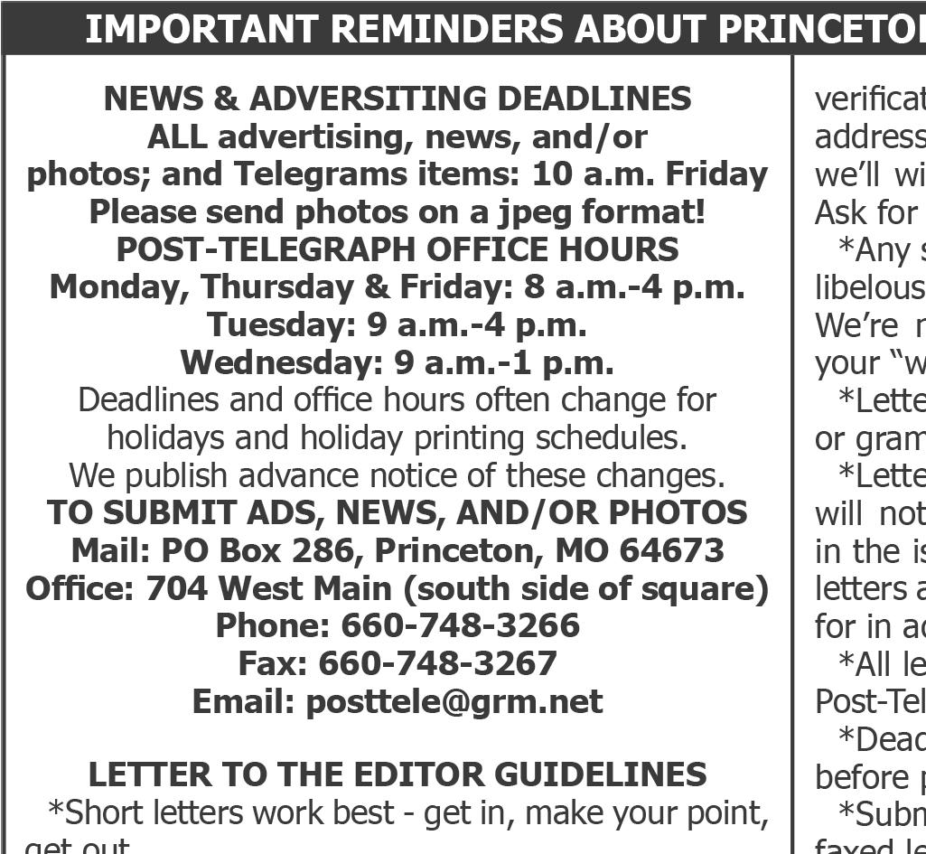 The Princeton PostTelegraph strives for accuracy and fairness in all of its news stories and photo captions. If you feel we have made an error, please contact us at 660748-3266 or posttele@ grm.net (email) to request a correction. If it is found we are in error, we will be happy to publish a correction or clarification.