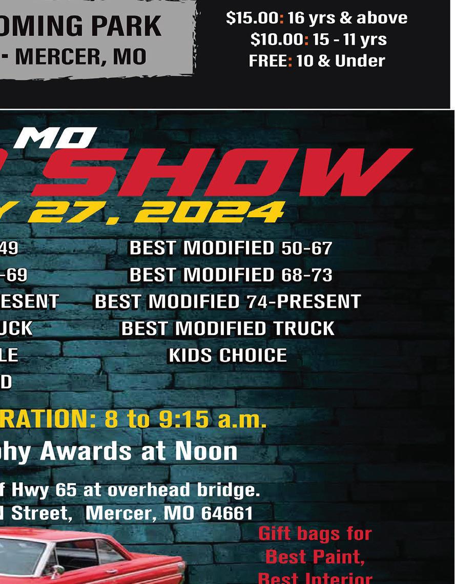 There were 61 entries in our car show. There were entries from Blockton, Iowa, Davis City, Iowa, and Grant City, Coffey, Princeton, Ridgeway, Bethany, Kearney, Gladstone Cainsville, Trenton, Blythedale, and Topsy, Mo. Classes included pre60 stock, pre-60s modified, off-road, 74-present, tractors, drag cars, trucks, best Mopar, best Ford, best GM, best other, a kid’s choice award and best of show. Best Mopar went to Randy Smith from Topsy. Best Ford went to Jay Lane from Kearney. Best GM went to Pete Hill of Grant City. Best other went to Don Wilburn Cainsville. Kids Choice was Jerry Myers from Davis City. Best of show went to Jay Lane from Kearney.