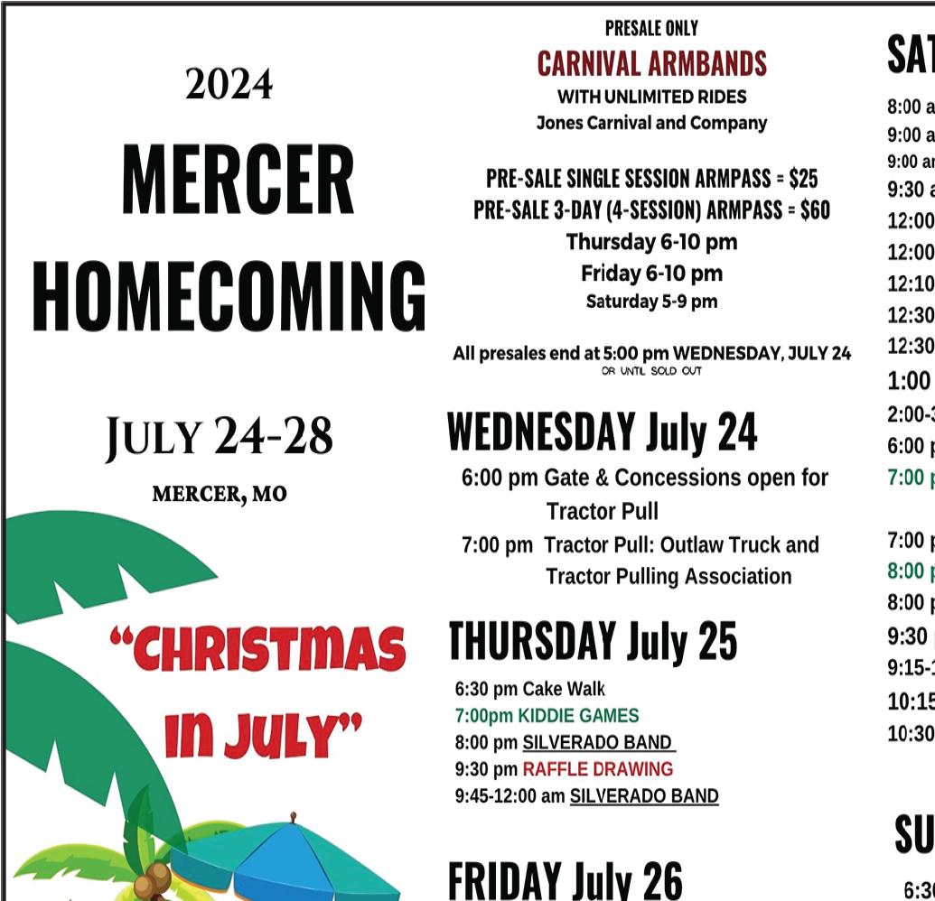 MERCER, Mo. The annual Mercer Homecoming weekend will be held next week, July 24-28, with a theme of “Christmas in July.”