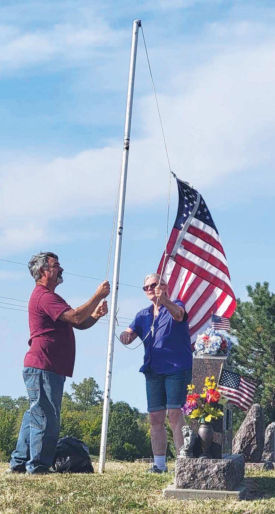 COURTESY PRINCETON VFW Princeton VFW Post 7159 raised American flags at Princeton Cemetery on Sept. 10 in honor of the 23rd anniversary of the 9-11 attacks the morning of Sept. 11, 2001. The largest flag was lowered to half-mast in remembrance of those who lost their lives on that tragic day. Mike Pauley (left) and Post 7159 commander Ruth Ann Shipps installed the flag shown. Others helping raise and lower the flags were Mark Yungeberg, Greg Frost, Jim Dusenbery, Winn Holt, Paul Smith, Timothy Stark, TJ Stark and Lyle Pollard. The flags were lowered on Sept. 12.