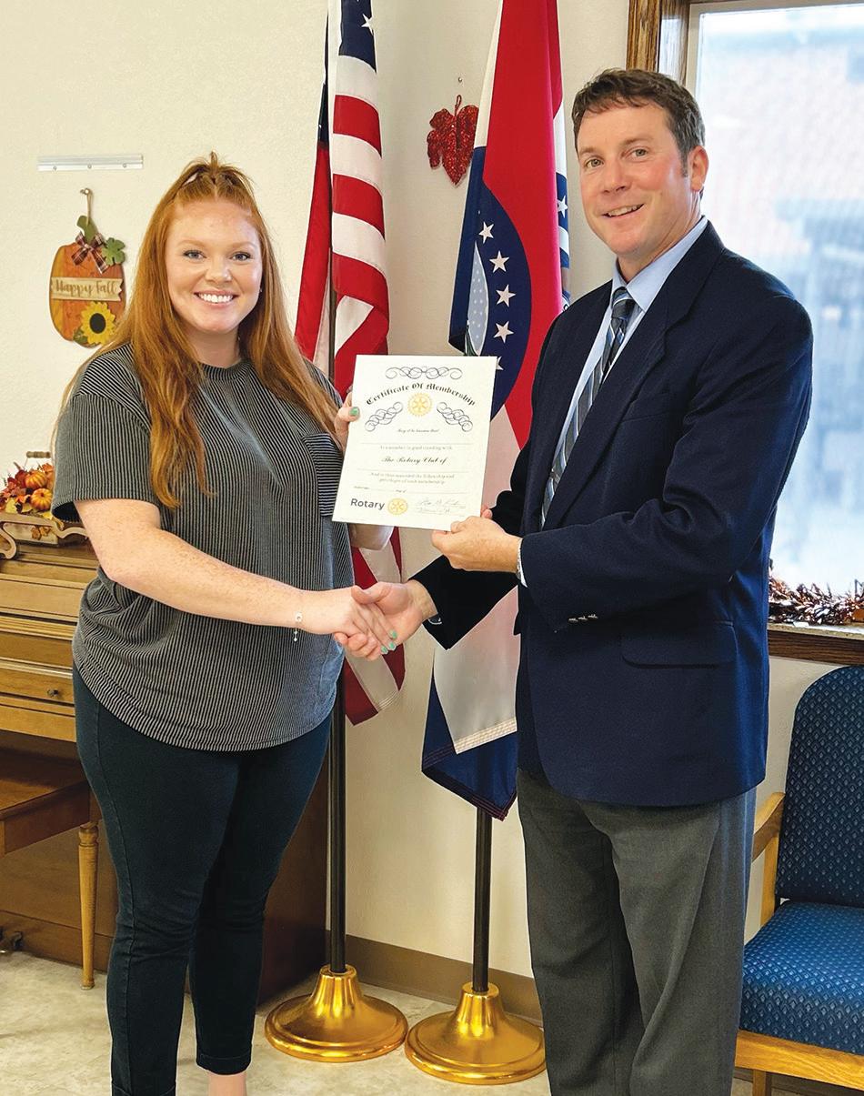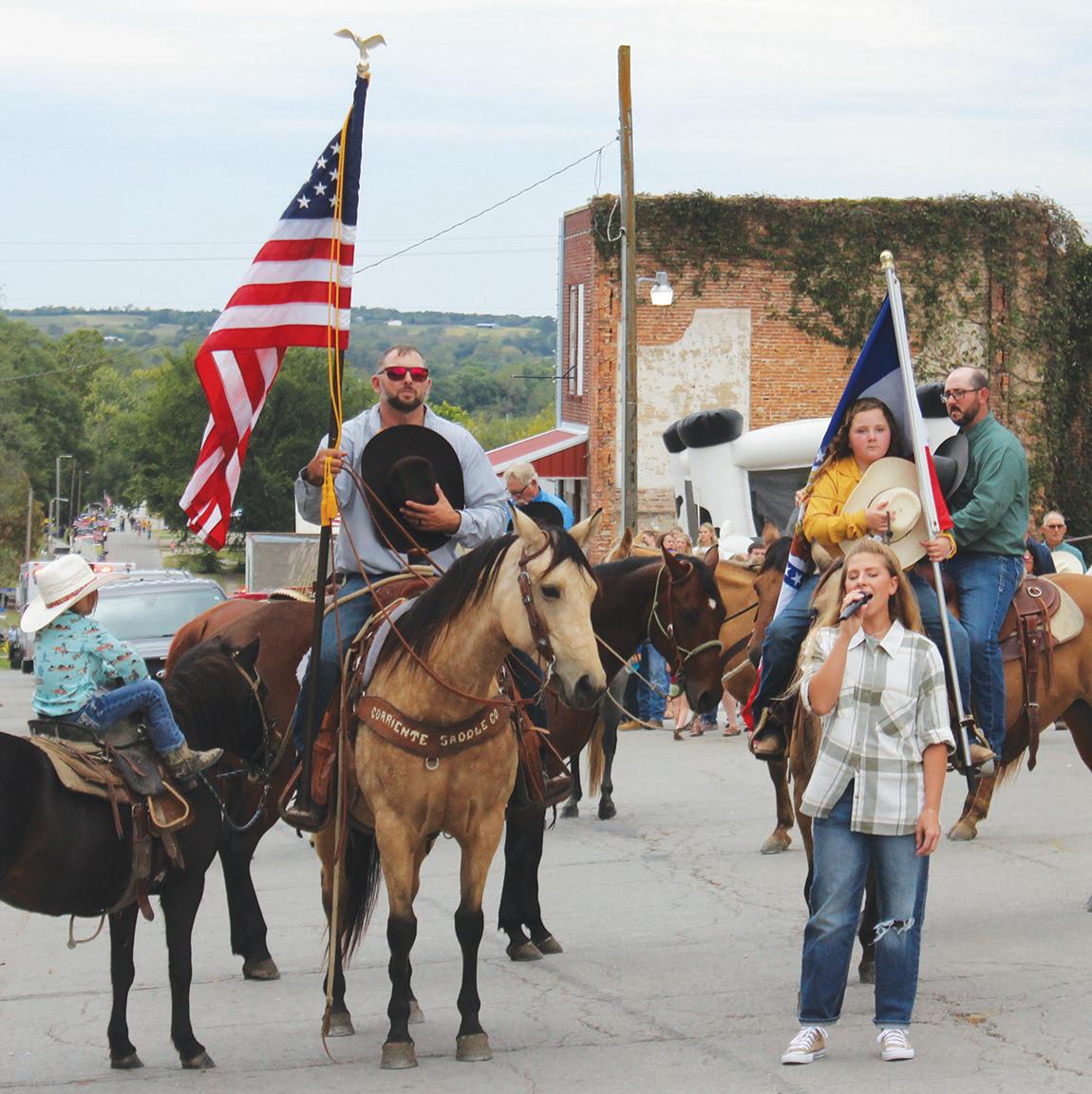 afternoon. Chance Holt carried the American flag and Halle Allen carried the Missouri state flag. Felisha Bertrand (standing) sang The Star Spangled Banner as the parade stopped on the south side