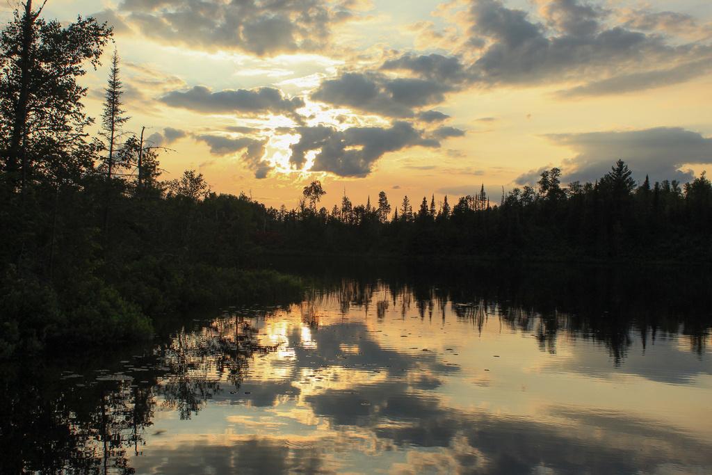 The new campsite was barely 5 miles up the road from the previous night’s, but felt like a world away Instead of a small clearing surrounded by tall deciduous trees, our new campsite was a large field with the picnic table and fire ring tucked onto a small rise next to the rows of pines separating us from the adjacent campsite A gentle breeze kept the mosquitoes out of camp and allowed us to enjoy all of the long northern Minnesota summer evening with only normal amounts of bug spray We pulled out camp chairs and the bottle of wine we had saved for that night, enjoying each other’s company as dinner sizzled on the camp stove Dragonflies buzzed around camp, no doubt snacking on the few mosquitoes that were around A leisurely dinner completed, we wandered down to the boat launch at the far end of the campground, pausing on our way to talk to a father and his young son setting up camp with whom our dog made instant friends Standing on the dock, we watched the sunset over the calm water until once again the mosquitoes chased us back to our open field campsite, and darkness chased us into our tent for the night.