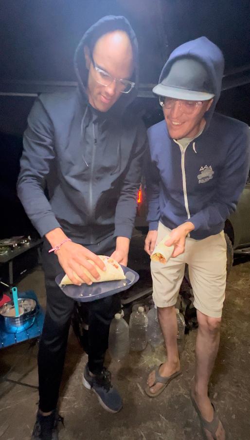 Top: Enoch marvels at the size of the ginormous burrito Braxton had assembled compared to his own