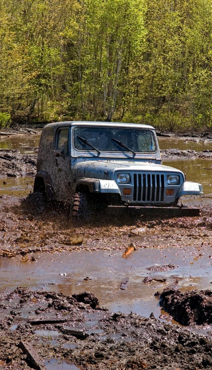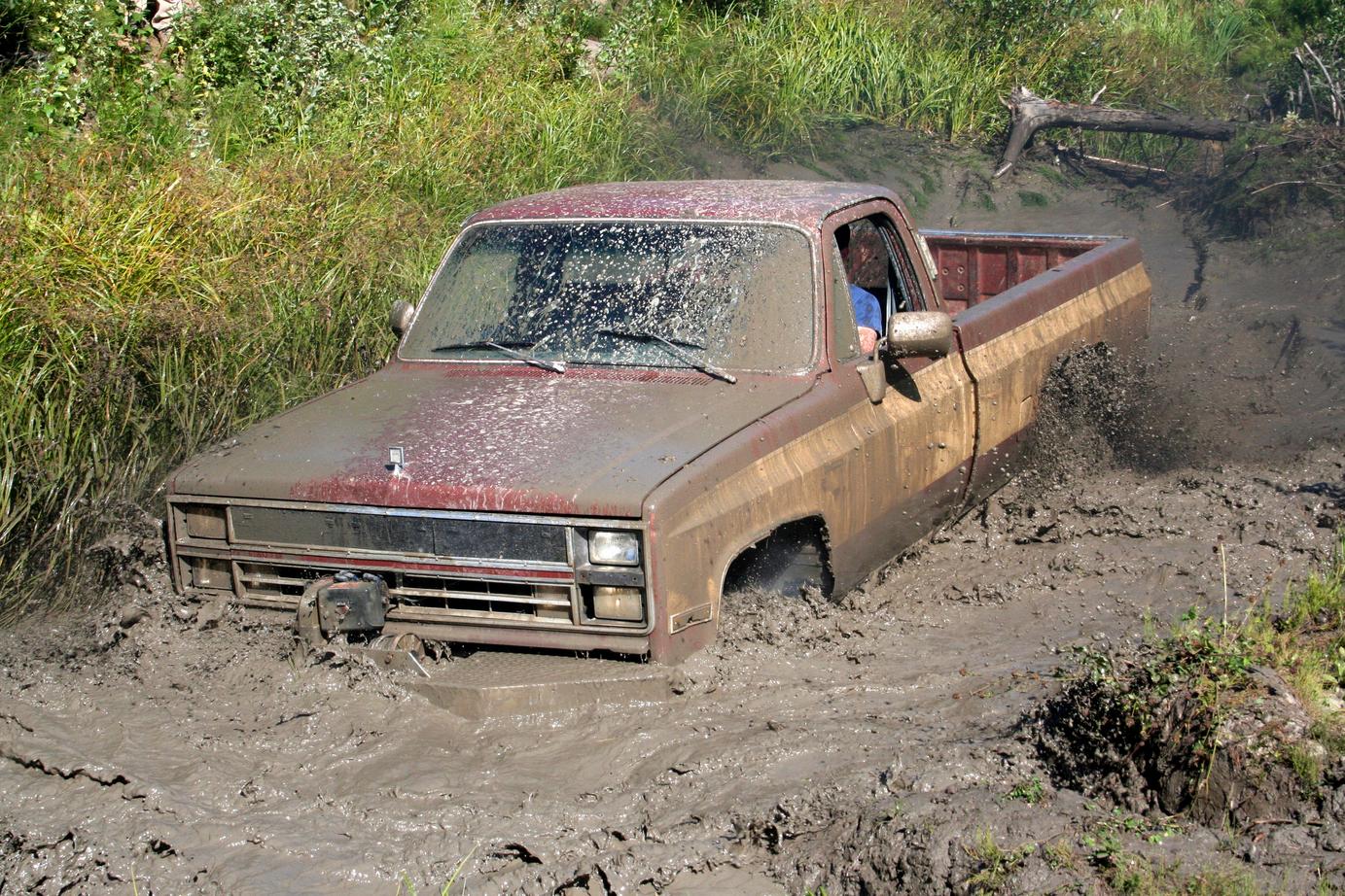 The rear tire sinks deep into mud. The driver attempts to reverse but only digs the tire deeper. You all step out to begin a recovery.