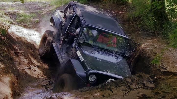 Jordan grabs a recovery strap and walks toward the front of the stuck vehicle to help guide the process. As they step near the edge of the rut, the muddy bank collapses beneath them.