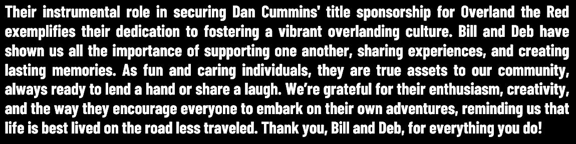 Thank you, Dan Cummins Auto, for your incredible support as the title sponsor of Overland the Red Your commitment to the overlanding and offroad community, and especially your passion for Jeeps and 4x4 trucks, has elevated this event to new heights. We re thrilled to partner with you to create a basecamp where adventurers can come together, learn, and connect, all while experiencing the thrill of overland exploration.