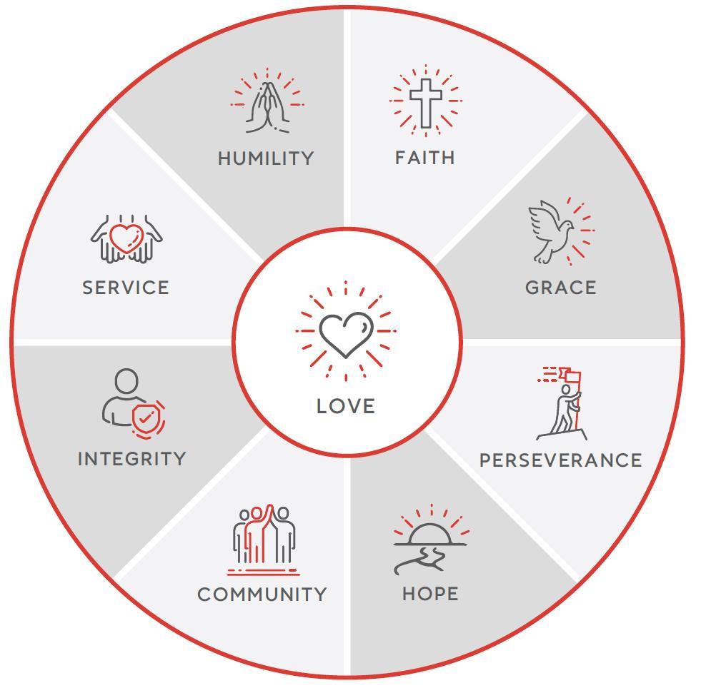 Everything is influenced by the Core Values; they shape and are seen in everything that we do. We hope that the College is known by the expression of Faith, Hope, and Love as demonstrated by a sense of Community, Service, and Grace. When our students leave the College, we want them to be young people hallmarked by Humility, Integrity, and Perseverance.