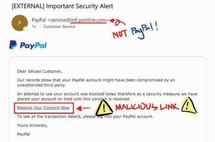 There is an increase in email addresses being masked (spoofed) to steal personal information such as login or banking details, doing so by masquerading as a trusted sender or an organisation. The below is a real example of an email masked as PayPal to steal login credentials.