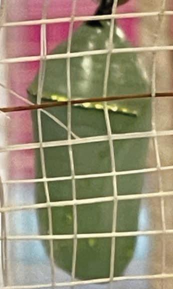 Observation: Today one has hatched overnight. It is a girl because it does not have dots on its wings. Today a chrysalis has also become fully translucent. You can now see the butterfly and its body really clearly. You can also see the beautiful brown and orange colour on the butterfly’s wings.