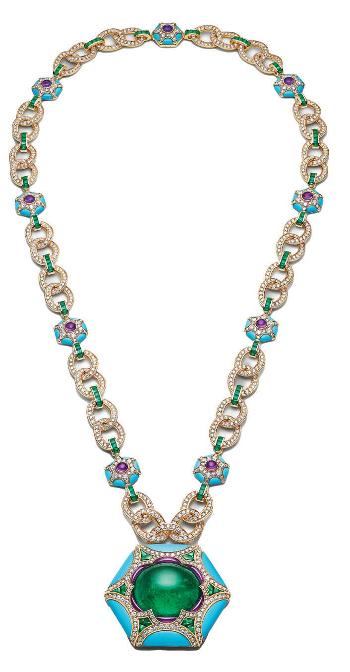 18K white gold, onyx, set with 2 emeralds and 225 brilliant-cut diamonds totalling 2.55 carats.