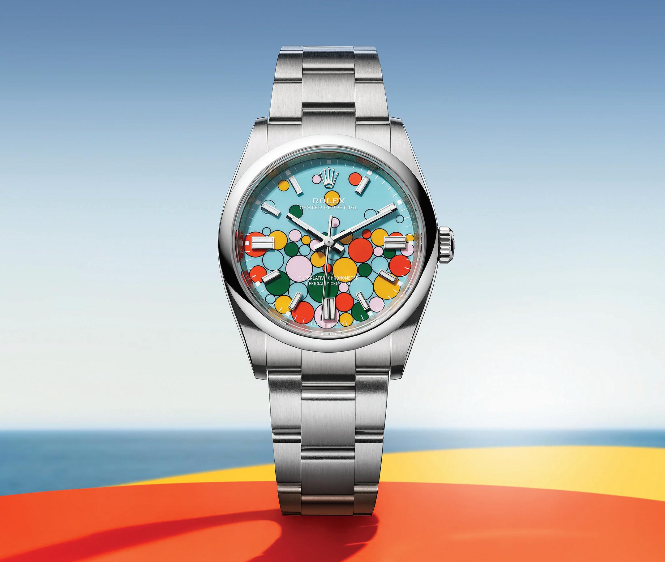 Rolex's newest collection of the Oyster Perpetual features colourful bubbles of different sizes fringed in black. This new version combines the vivid colours introduced in 2020: candy pink, turquoise blue, yellow, coral red, and green. The Oyster Perpetual 36 and Oyster Perpetual 41 are both fitted with calibre 3230 entirely developed and manufactured by Rolex. These new Oyster Perpetual designs are made from Oystersteel — incorporates the latest advances in Rolex technology, including the high-performance Paraflex shock absorbers. This special steel, offering an exceptional sheen, is produced exclusively for Rolex. rolex.com | JP