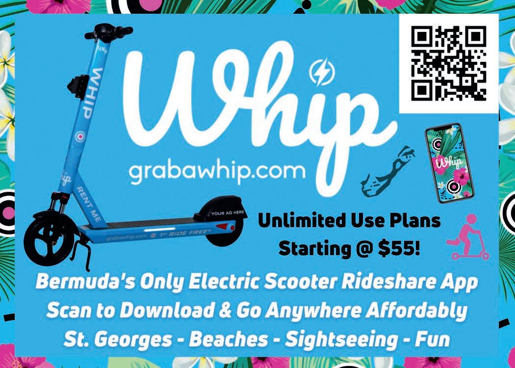 Pedego Electric Bikes Bermuda (533-8687; www.pedegobermuda.com), located in St. George’s, offers electric bikes for rent starting from $90 for a day to $500 for a week. Tours are also available to explore sites around the East End of the island starting at $150. Oleander Cycles rents electric bikes, and they have locations islandwide (236-2453; www.oleanderebikes.com). Whip Rideshare E-Scooters (www.grabawhip.com) have pickup locations islandwide, and you can explore the City of Hamilton, Dockyard, South Shore beaches, or St. George’s on your own time. Whips can be left anywhere around the island and not at a designated location. Unlimited-use subscription packages are available for three days, and weekly options start at $55.
