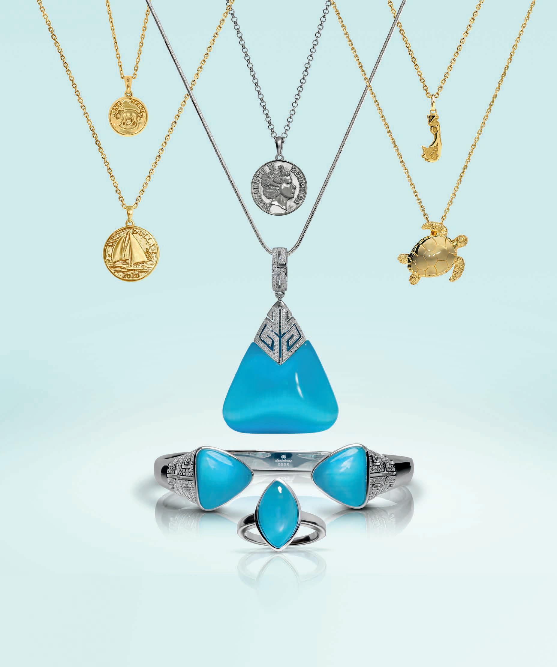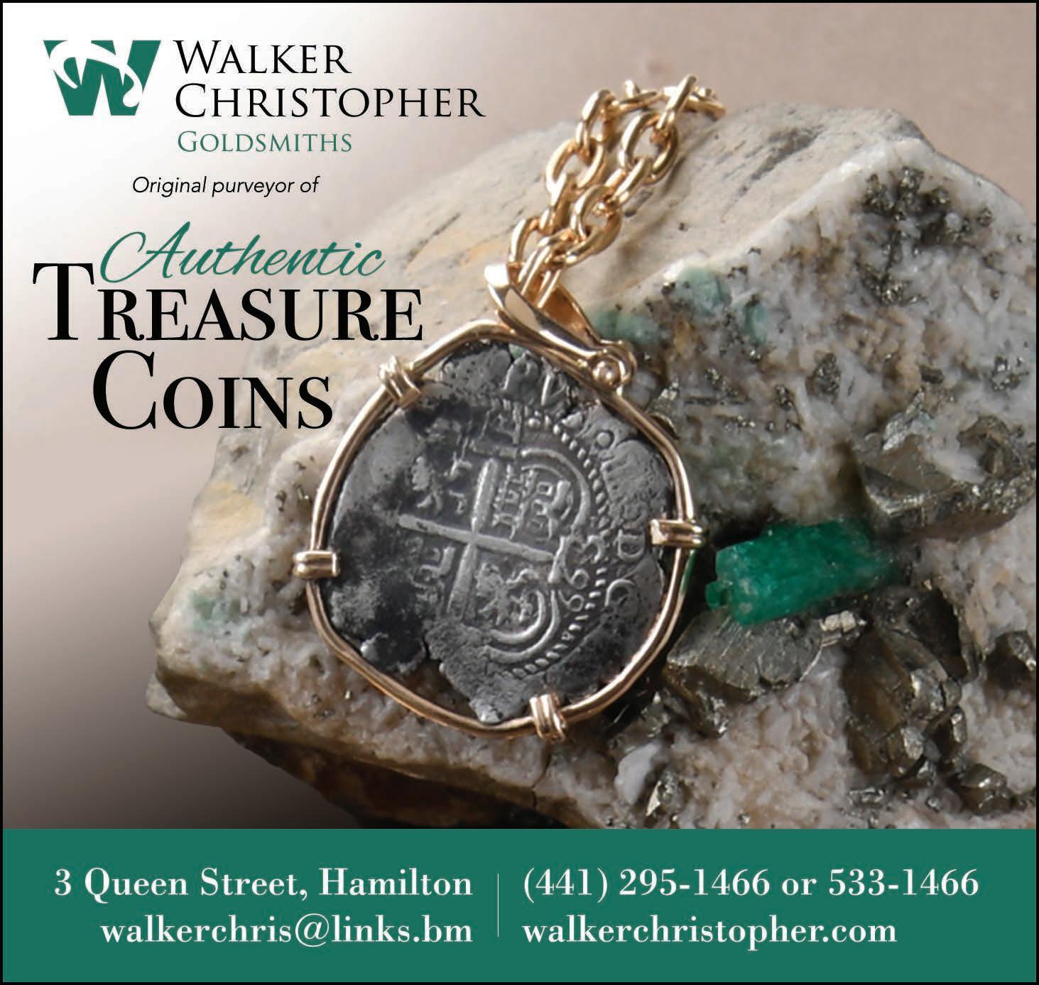Bermuda’s best fine jeweller for nearly 40 years and recommended by Condé Nast as a top shopping experience, this workshop specialises in crafting one-ofa-kind pieces and showcases an excellent collection of authentic coin jewellery. Walker Christopher is the original purveyor of gold doubloons and silver pieces of eight salvaged from sunken galleons as well as Greek and Roman coins dating to 400 BC. Coins featuring Julius Caesar, Alexander the Great, and Cleopatra are creatively set as pendants, earrings, and cuff links. Museum-quality Egyptian artefacts have been transformed into wearable art. The workshop produces its own line of Bermuda-inspired jewellery and sterling silver ornaments. Visit their new showroom located above Waterfront Man on Front Street. You can enjoy harbour views whilst travelling back in time through history. The entrance is at 3 Queen Street through the wrought iron gate next to the Bermuda Book Store. At the top of the stairs, pass through the glass double doors, where you will find Walker Christopher on your left.