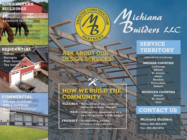 MICHIANASHOWCASEMAGAZINE.COM PAGE 5 The secret of success is to do the common thing uncommonly well. ~ John D. Rockefeller Jr. NMLS: 623379 ¹Any new lot loan that is closed between November 1, 2023, and December 31, 2024, that converts to a construction loan within a year of purchase, may redeem this coupon to waive origination charges on both loans. This will be refunded at loan closing. Fixed or adjustable rate available. One-time closing. 12-month construction period. Interest-only payments during the construction period. Must present coupon to an Interra Loan O cer to qualify. O er available for primary residence only. Must be 18 years of age or older. Terms and conditions of this o er, including its termination, may change without prior notice. Some restrictions may apply. Loan subject to qualifications and approval. Not all will qualify. Membership eligibility is required. Construction Lending is di erent here. Let’s find the perfect property then build that happy home - together Get building at interracu.com/mortgage Apply today at interracu.com/mortgage 574.534 2506 Any new lot loan that is closed between November 1, 2023 and December 31, 2024 that converts to a construction loan¹ within a year of purchase, may redeem this coupon to waive origination charges • Amish financing available • Purchase plus improvement options • One-time close; rate locked in at origination • 12-month construction period Lot and Construction Loan Origination Charges Waived Call to schedule your pour Josh • 260-336-2257 Chris • 574-304-3805 Concrete Delivery Service Providing Concrete Redimix • Mix on your job site as you need it • Up to 10 yard loads • Up to 1 yard a minute • 7 mix designs • Up to 24 colors • Pay for what you use Stop Leaks Save Energy & Money Long Term Protection Satisfaction Guaranteed CALL (260) 977-8981 FOR A FREE ROOF INSPECTION! 4765 S 500 W, Topeka, IN 46571 Commercial & Residential Roofing
