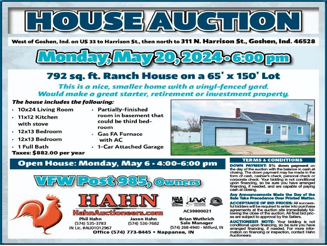 A A&B Lawn and Landscaping 574-238-6457 12 Alpha Building Center 260-768-4410 21 Anchor Insurance 269-506-2057 44 Arrow Industrial 574-350-7750 31 Artistic Stone 574-546-3771 35 B Bill's Long Reach Excavating 260-336-0775 30 Borkholder Vinyl LLC 269-659-8588 28,29 Bright Star Auctions 574-825-0704 34-35 Upcoming Auctions 34 Tube Fabricators June 24 34 Michiana Equipment Auction June 28 35 Bright Star Real Estate Services 574-821-7653 22-25 Current Listings 22 Business Opportunities 23 Donald L. Swank May 21 24 Eric & Kelly Swank May 21 25 Brighter Edge Roofing 574-971-1715 39 Bullseye Industrial Sales Inc 574-825-4990 4 Bushmon Tree Removal LLC 260-215-3661 11 C C&T Seamless Guttering LLC Services 574-354-3448 18 Casey's Erosion & Seed Solutions 574-533--7900 46 Champion Well Drilling 574-862-4253 29 Choice Cabinets 574-825-0073 39 Chupp Auctions 260-768-7616 48-58 Melvin & Orpha Hochstetler . . . . May 18 . . . . . . . . . 48-49 Miguel Rocha May 20 50 Marc F & Mary Sue Wingard May 22 51 Joseph & Karen Yoder . . . . . . . May 28 . . . . . . . . . 52 Mel & Laura Eash May 29 53 Henry & Edna Miller June 3 54 Lavon & Dorene Miller June 3 55 Monty & Tina Rose June 4 56 Philip & Kim Allen June 5 57 Upcoming Auctions 58 Classee Vinyl, Inc 574-825-7863 35 Clearview Roofing LLC 260-214-4414 30 Complete Designs 574-206-6937 61 Concrete Impressions 574-527-1322 41 Cornerstone Woodworking 260-535-0978 ext 1 44 Country Garden Center 260-593-3747 94 Countryside Bargains 574-825-0717 87 Crossroad Tours 260-768-7549 60 D D&L Appliance Repair & Service 260-768-7727 59 D&L Metal Sales 260-463-6425 17 D&M Concrete Crushing 574-642-4711 10 D&S General Construction 260-350-5608 8 Double L Home Builders 260-350-8538 14 Dutch Cleaning Service 574-537-0997 41 Dutchman Log Furniture 260-562-3064 14 E Eash Sales 260-768-7511 16 Eko Powder Coatings 574-536-2859 27 Elite Covers & Interiors 260-214-0518 86 Elite Curbing 260-214-1172 94 Energy Efficient Replacements 574-387-3297 85 F Family Value Flooring 260-593-2213 9 Farmers Insurance - Daniel Lockett 775-267-7625 92 Fry's Repair Shop 260-593-3228 46 G Grand Rental Station 269-279-6041 36 Green Valley Harness & Welding 269-467-4946 71 Griffin Taxidermy 574-596-0144 97 H Hahn Auctioneers 574-773-8445 68-71 Great Lakes Contractor Services May 14 68 Moore Brothers Enterprises . . . . May 21 . . . . . . . . . 69 Alan & Judy Haines May 23 70 VFW Post 985 May 20 71 Hands of Hope 260-350-0392 78 Hays Painting & Construction 574-612-4473 92 Homer’s Services 260-768-7488 90 HomeStyle Furniture Shoppe IN 574-546-2508 40 Hometown Improvements 574-361-6747 94 Hoosier Handyman 11 260-336-6532 90 Hoosier Power 574-858-2169 42 Horizon Bank 574-849-5777 44 I Ideal Attachments 260-535-1545 101 Indiana Structures 574-202-8199 47 Integrity Overhead Door 260-977-8526 47 Interra Credit Union 5 J Jay's Auctions 269-432-3169 19 JC Rentals 260-336-8542 11 J&S Auctions & Real Estate 574-642-0444 80-84 Carl & Regina Schwartz May 13 80 Lyle & Karen Yoder May 15 81 Caring Hands & Riding Horse Auct. May 17 & 18 82 Scott & Susan Pierce May 21 83 Memorial Day Pony Auction May 27 84 J & S Flooring 574-773-2673 71 JET Technologies 574-264-3613 38 JLM Transportation 260-463-6476 90 Joe’s Engine Shop 574-546-4413 36 L L A Woodworking 574-825-5580 73 Lake X-Ray Inc 269-782-2981 64 LaRose Shelters 260-336-8886 92 LPS 574-970-1379 93 Luxx Custom Trailers 260-768-7317 62,63 Advertisers index Next Ad Input Date: Monday