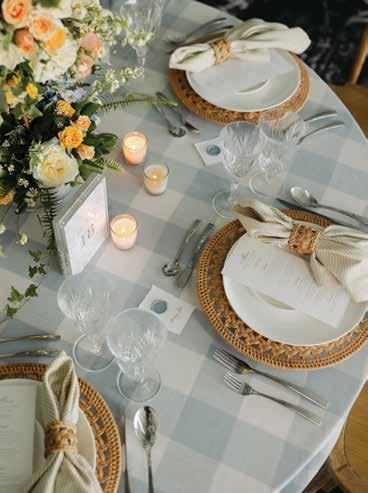 For this styled shoot, Snapdragon Designs and AAYS Event Rentals created a fresh, 1990s-inspired country club wedding design. The look featured soft blue and white gingham plaid, rattan chargers and complementing rattan napkin rings. The clean, crisp tablescape perfectly embraced the classic country club aesthetic— timeless and elegant, just like a summer night.