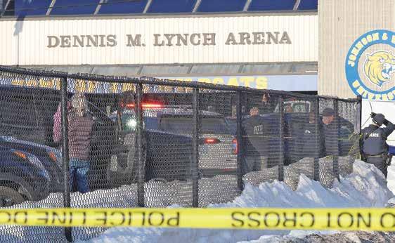 A SHOOTER unleashed a urry of bullets during a Rhode Island youth hockey game, killing two people and injuring three others, in an attack that was cut short when a spectator stepped in to help stop the tragedy, authorities said. Investigators had spoken to nearly 100 witnesses as of Monday evening as they attempt to piece together what happened early Monday afternoon inside the Dennis M. Lynch Arena in Pawtucket, a few miles outside Providence. Pawtucket Police Chief Tina Goncalves said Monday that the shooter died from an apparent self-in icted gun wound, though authorities are still investigating.