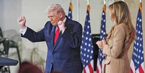 the world’s largest military bases, Trump declared, “Your commander in chief supports you totally.” Then, drawing on one of his own campaign slogans, he implored them, “When needed, you’re going to ght, ght, ght. You’re going to win, win, win.”