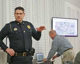 Using a downtown map on a video monitor, Taylor pointed out the current parking rules for downtown which show a mix of one- and two-hour parking restrictions. He pointed out there are signs in the area that were installed in 1965.