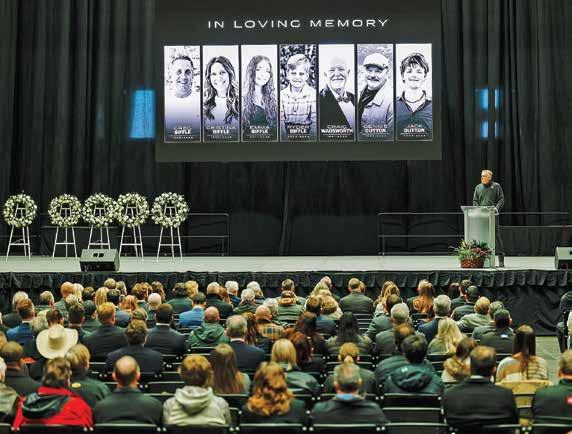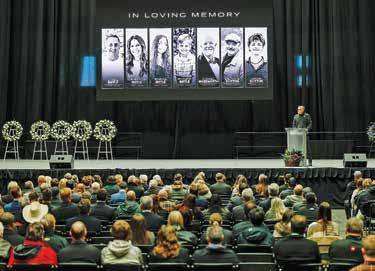 Inside, the pictures of the seven who lost their lives were shown on a videoboard above the makeshift platform in the center of the covered hockey rink. There were seven wreaths on the stage where Mitchell, Bi e and former drivers Je Burton and Phil