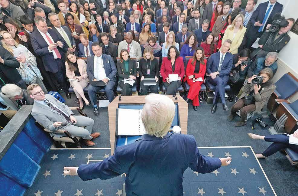 President Donald Trump speaks after making a surprise appearance at a White House press brie ng Tuesday, marking one year from his second inauguration.