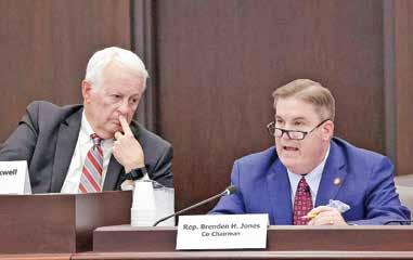 CHRIS SEWARD / AP PHOTO House Redistricting Committee Co-Chairs Rep. Hugh Blackwell (R-Burke), left, listens as Rep. Brenden Jones (R-Columbus) speaks during a committee meeting regarding a proposed redistricting map on Oct. 21, 2025, in Raleigh.