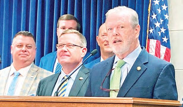 North Carolina Senate leader Phil Berger, R-Eden, right, speaks about a budget agreement reached with House Speaker Tim Moore, R-Kings Mountain, center, at a Legislative Building news conference in Raleigh, in June 2022.