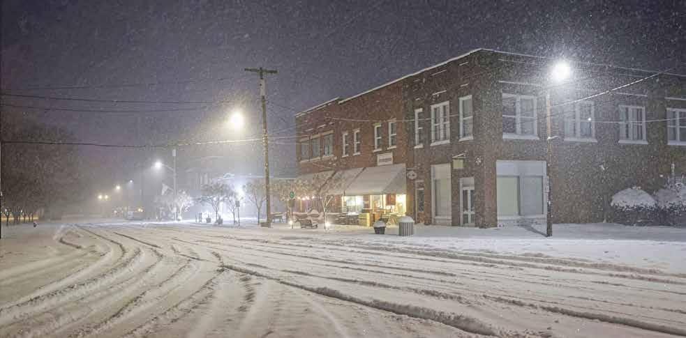 The streets of Badin were deserted Saturday night as snow blanketed the area.