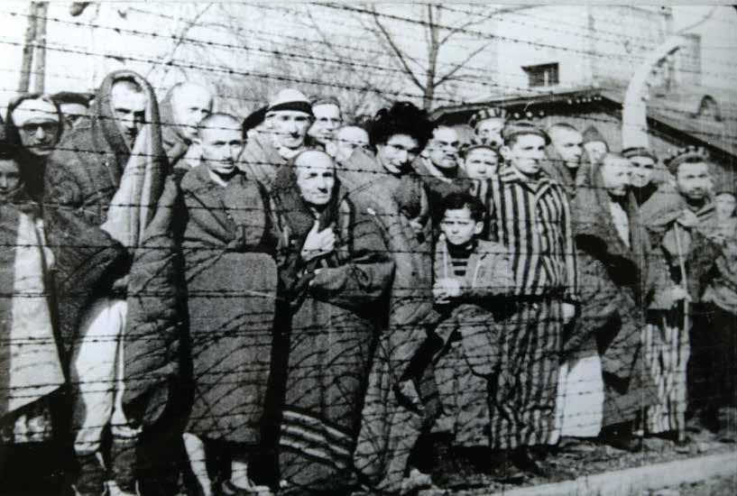 Newly liberated prisoners stand outside the German Nazi Auschwitz concentration and extermination camp in Poland on Jan. 27, 1945.