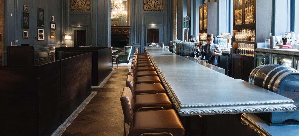 A once secret door aside the grand fireplace reveals a woodpaneled, domed-ceiling guest oasis, escape, or personal workspace by day; a hidden lounge for eating, drinking, and gaming by night. Rare, select productions and vintages of bourbon, single malts, ryes, and more are served neat, in flights, or crafted as classic “three-ingredient” cocktails.