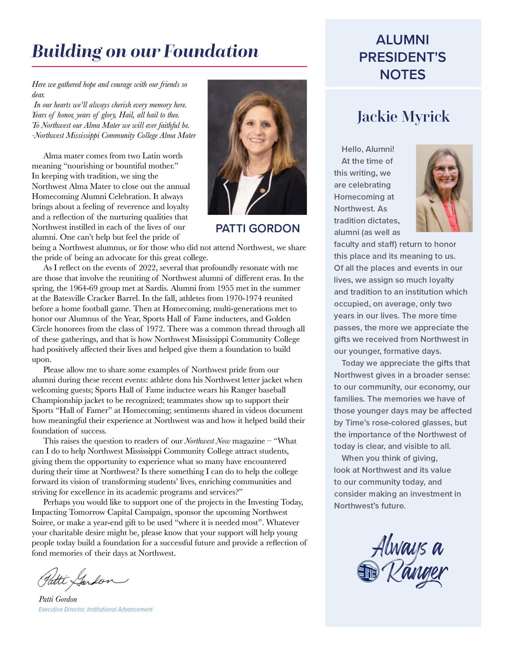 The athletic growth on campus has been very exciting. Our student-athletes are the best in Mississippi, which is demonstrated by their hard work on the field and court, and in the classroom. Northwest was honored by having five All-Academic teams this year, and two of those teams—women’s soccer and football—had not only the best academic standing in the state, but were also recognized by the NJCAA as having the highest GPAs in the country. The Rangers continue to make strides in the post-season and on the national stage with our Ranger softball team, women’s soccer team, and football team all participating in their respective national playoffs. Ranger Athletics grew this fall by adding men’s and women’s tennis.