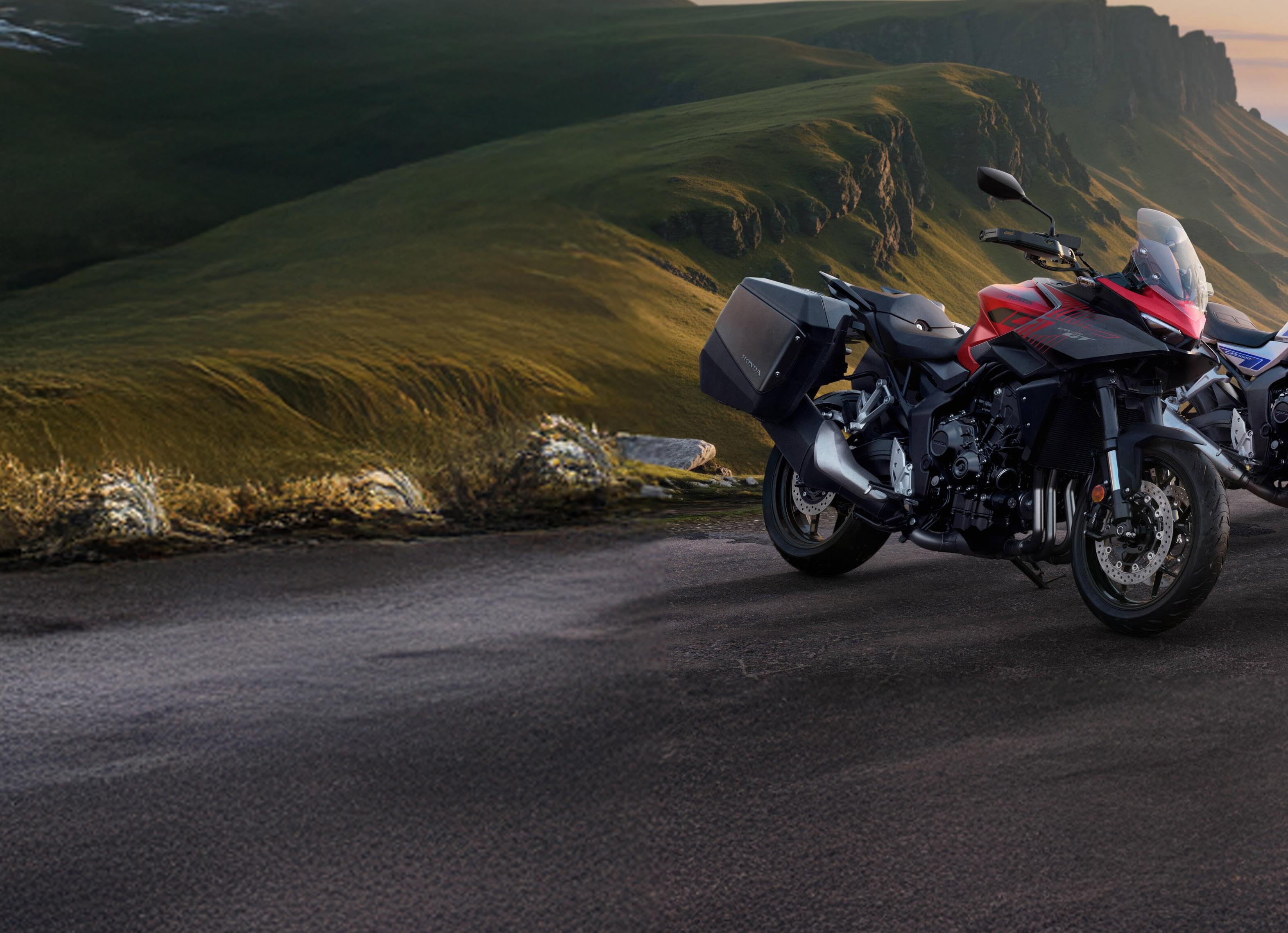 The new CB1000GT brings a premium, fully equipped sportstouring option to Honda’s range. Powered by the Fireblade-derived engine shared with the CB1000 Hornet, the GT blends sharp performance with exceptional comfort. Aerodynamic bodywork shaped through CFD modelling provides high-speed stability and strong weather protection, while Showa EERA suspension ensures plush ride quality on long journeys and agility when the roads get twisty. Standard equipment is extensive: throttle-by-wire, cornering ABS governed by a six-axis IMU, quickshifter, cruise control, heated grips, rear panniers, Honda RoadSync connectivity, knuckle guards, autocancelling indicators, a centre stand and Emergency Stop Signal. The CB1000GT thus offers both touring luxury and sporting capability.