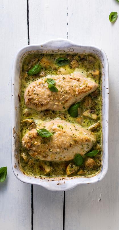 Del sopp i biter og stek med finhakket hvitløk i pannen, ca. 4 minutter. Ha i pesto, buljong, fløte og revet parmesan og rør til en jevn saus. Smak til med salt og pepper. Hell sausen over kyllingen i formen.